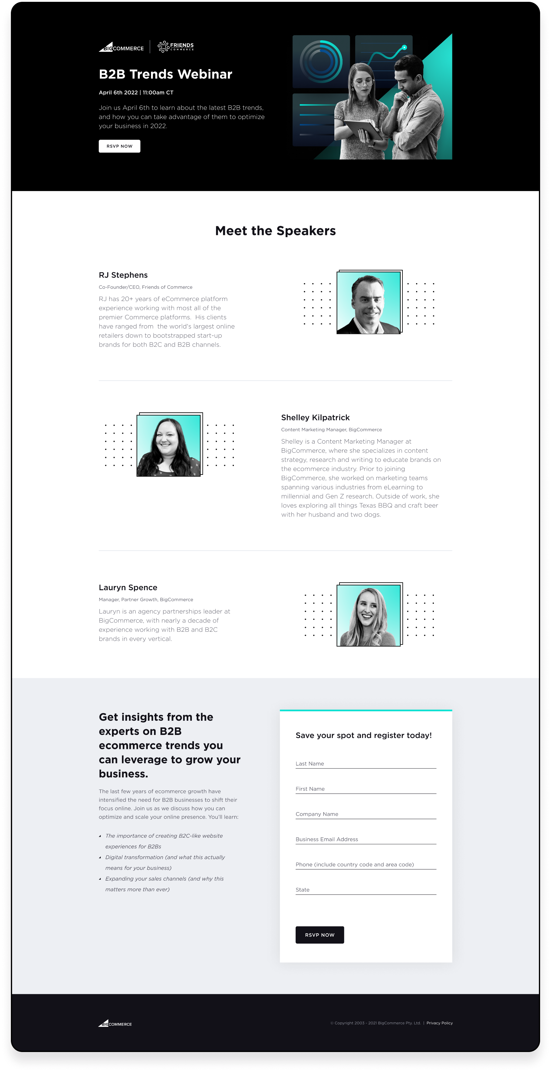 Most marketing campaigns & events required a landing page that users could go to get more information, sign up for an event/webinar, or to download content. I would work directly with members of the marketing team to put together a LP that fit the needs of their campaign. BigCommerce has a very thorough Figma library, making it very easy to drag and drop LP components and quickly create a comprehensive LP that web publishers could easily replicate. My role was to put the LP components together, make sure the copy was in place, provide visuals for the page, and nicely package it all up for handoff to the web team.